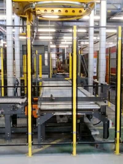 The plant included 6 palletising robots each with 3 row formers and 3 palletising positions. The robots were fed from a high speed sliding shoe sorter which in turn was fed by a 5:1 merge system running at speeds of 165 cases per minute. Product was collected from individual lines via 12 spiral elevators and fed to a high level conveyor system feeding the 5:1 merge. Pallets were fed to and received from the robot cells by a twin bed transfer car and full pallets were fed to an automatic stretch wrapper and labeller.